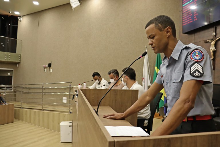 Atendendo a requerimento da Câmara, o secretário de Segurança e Trânsito da Prefeitura de Itabirito, Antônio Pataro, e o coordenador adjunto da Brigada Municipal, sargento Edivandro, responderam a questionamentos dos vereadores, nesta segunda-feira (27/9), durante reunião ordinária. O primeiro a fazer uso da palavra foi o militar (foto abaixo).